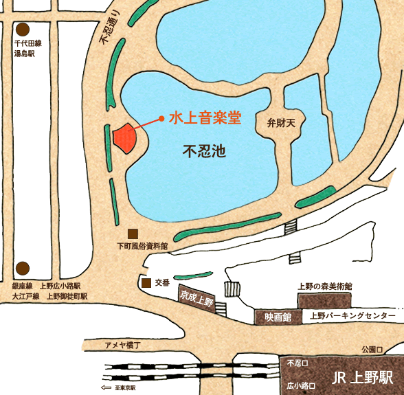 JRまたは東京メトロ「上野駅」不忍口より徒歩10分。不忍池(しのばずの池)のほとりです。